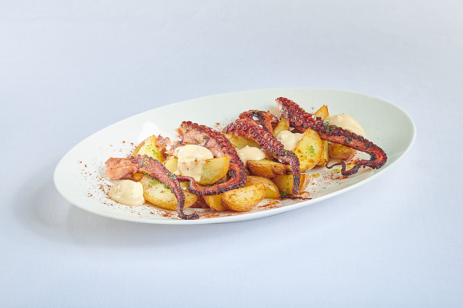 Nous vous recommandons le poulpe rôti avec aioli à l'ail noir et pommes de terre ridées, une option savoureuse et croustillante qui vous transportera sur les côtes du sud de l'Espagne.