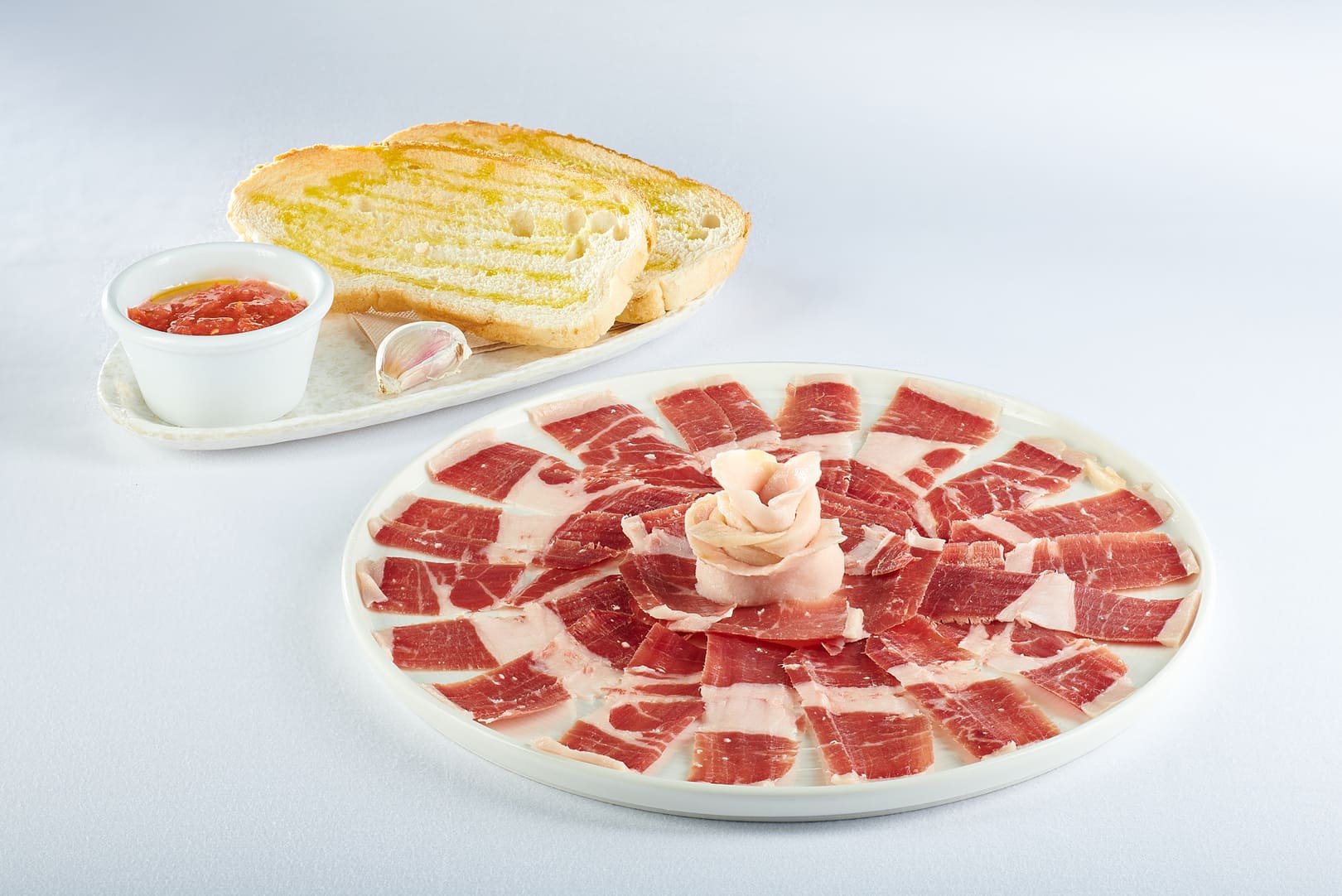 Nous vous proposons des options irrésistibles pour ouvrir votre appétit, et vous ne pouvez pas passer à côté de notre authentique jambon ibérique de Jabugo, fraîchement coupé à la main par notre personnel expert. Son goût intense et sa texture douce vous procureront une expérience unique.
